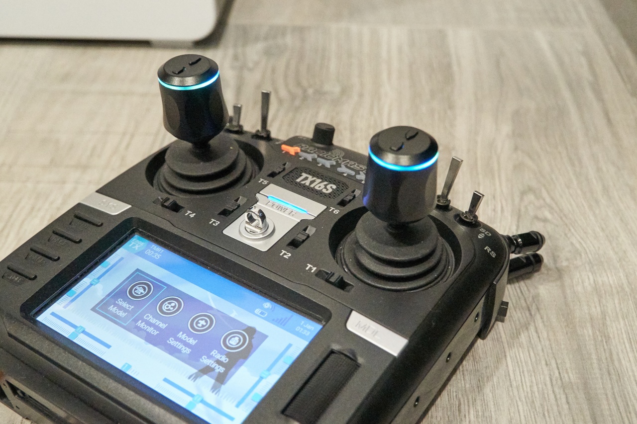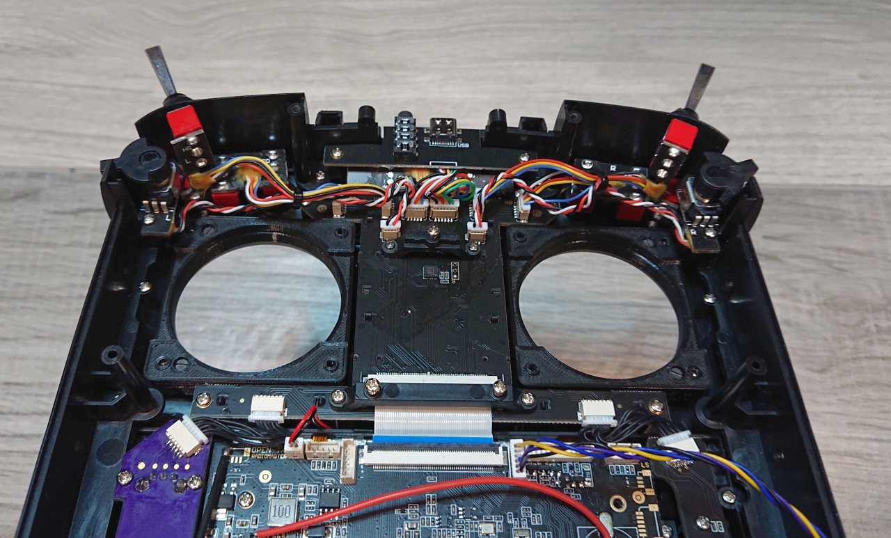 The channel outputs are sent to the radio transmitter via UART serial communication with 921.6 kbps transfer speed to ensure minimum latency. The sticks have a resolution of ca. 4500 discretization levels per gimbal axis.