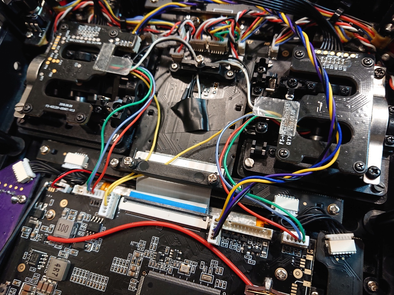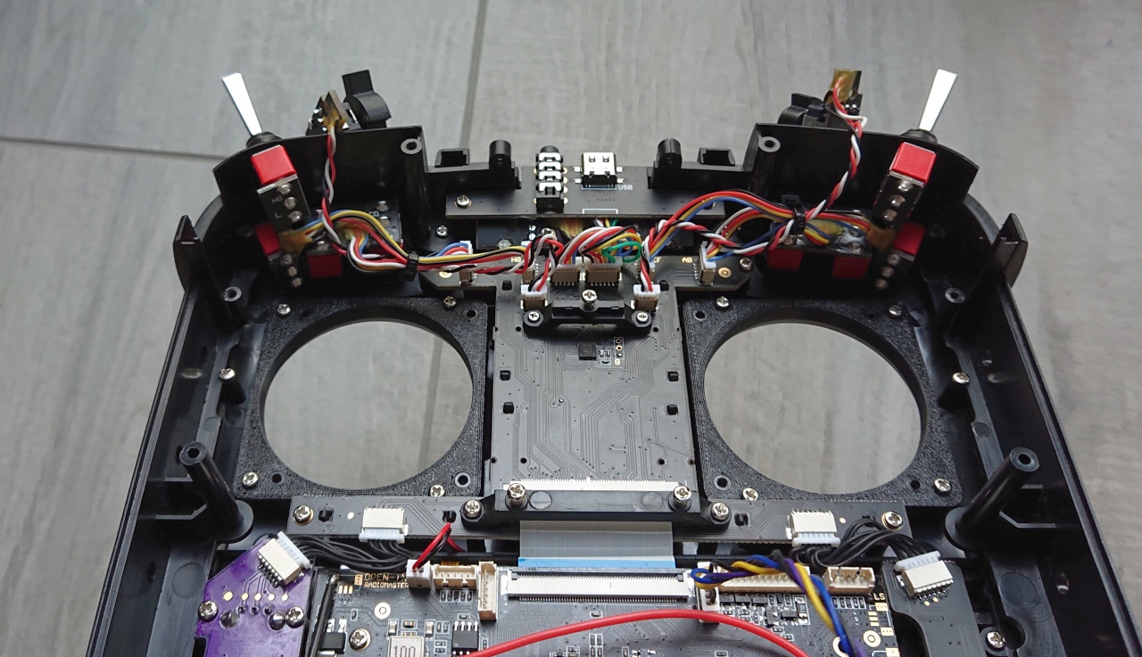 In a third step, the FlySky gimbals are mounted using two M2x6 screws (outside) and two M2x14 screws (inside) each onto the adapter rings. And finally, the included cable needs to be attached to the left gimbal connector on the TX16S mainboard, circled green on next image: