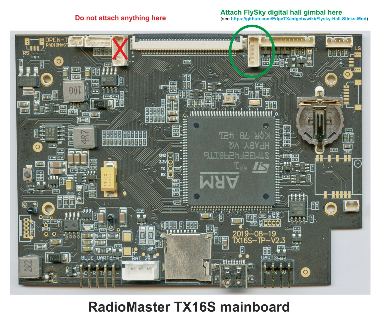 Further, please do note that on Boxer, the UART4 serial connection for digital gimbals is on the right gimbal header (when radio is looked from the back, then left side, as in the above picture), whereas on T16/TX16S/T18 the digital gimbals need to be connected to the left gimbal header.
