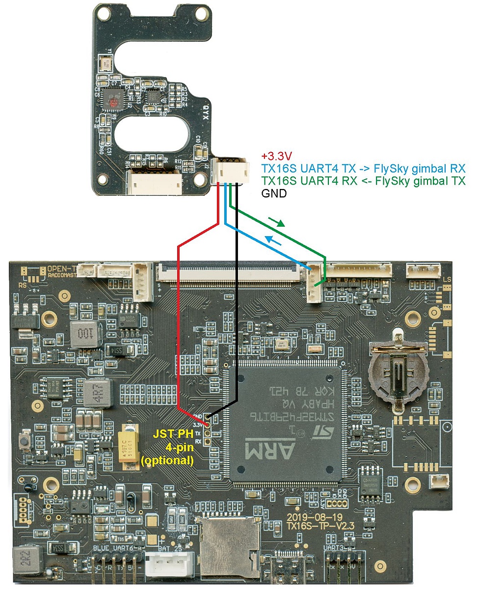The preferred way of powering FlySky digital hall gimbals on TX16S is from digital +3.3V power rail. This requires either soldering a JST PH 4-pin socket onto TX16S mainboard (recommended) or soldering the gimbal hookup wires directly to the mainboard. Hookup plan: