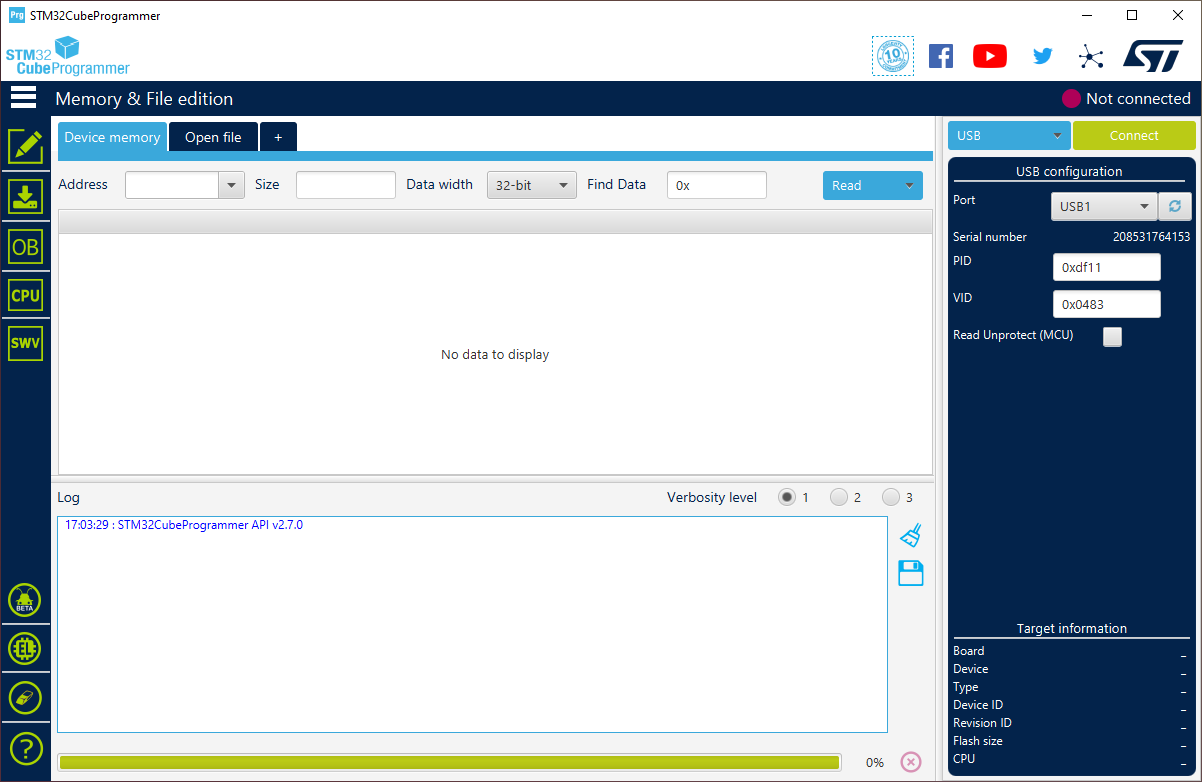 Start STM32CubeProgrammer. Your radio should be detected on the right side of the screen under