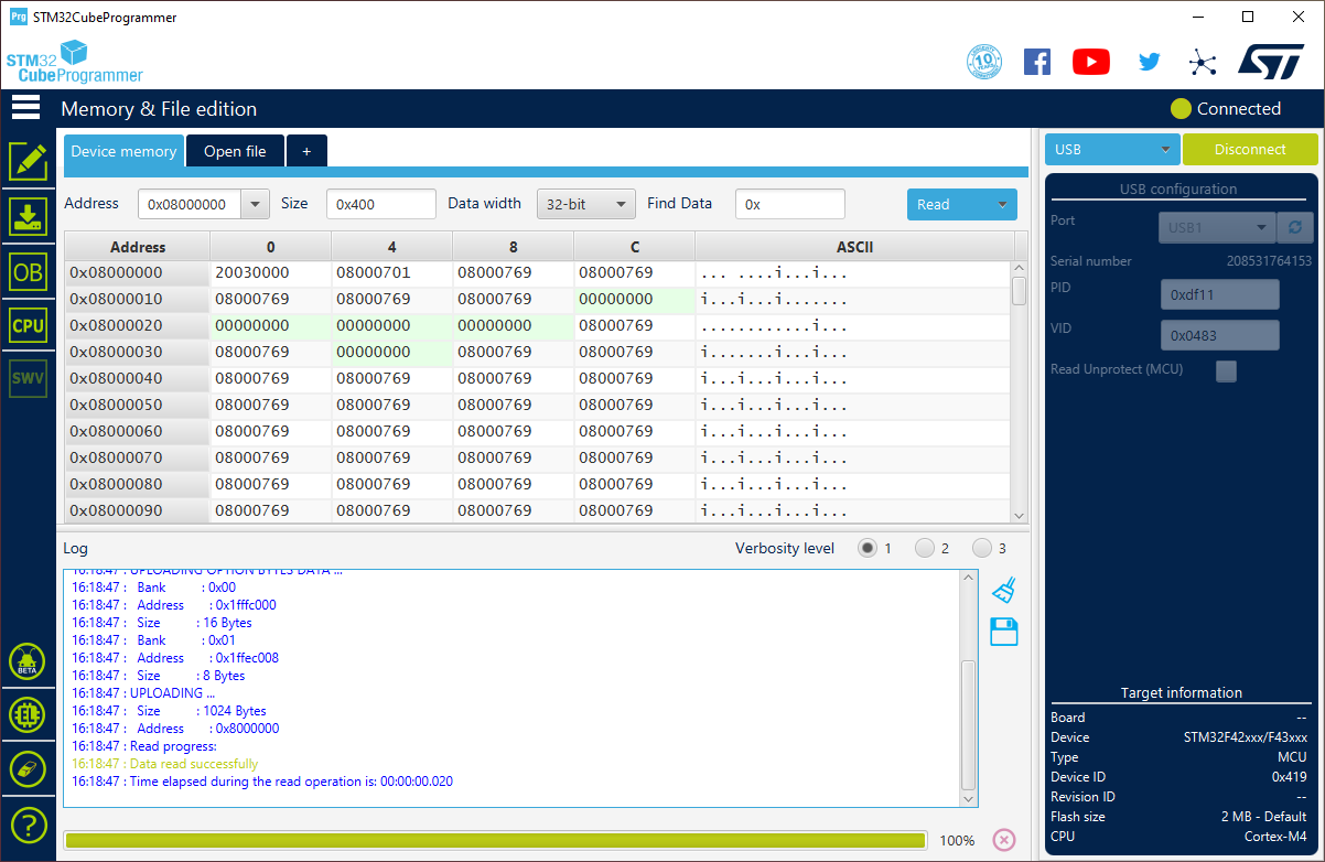 Connectbutton on top right. You might be greeted with some seemingly random content, do not get alarmed - this is all perfectly fine and just showing some of the first bytes of memory that are currently saved on the microcontroller. Most importantly, the lower right corner should now list under fieldCPUeitherCortex-M3orCortex-M4(according to your radio):