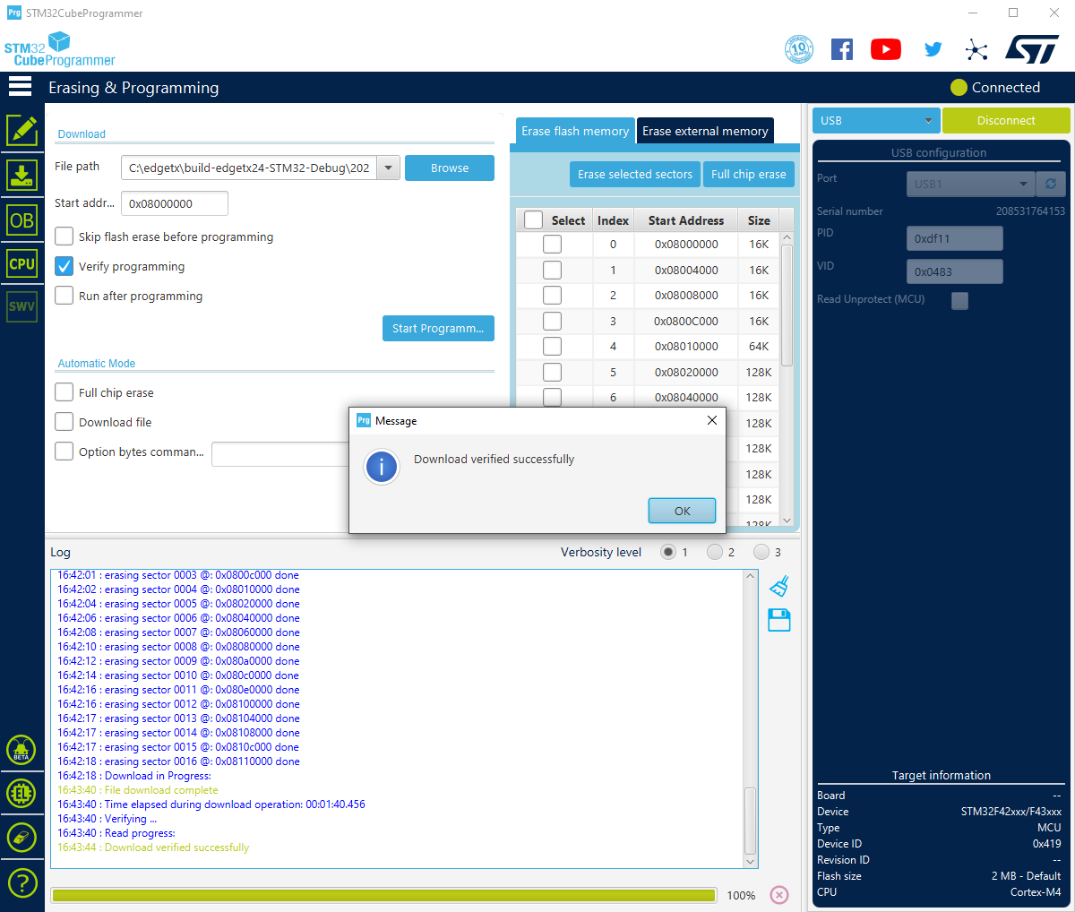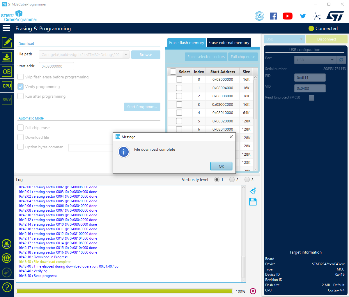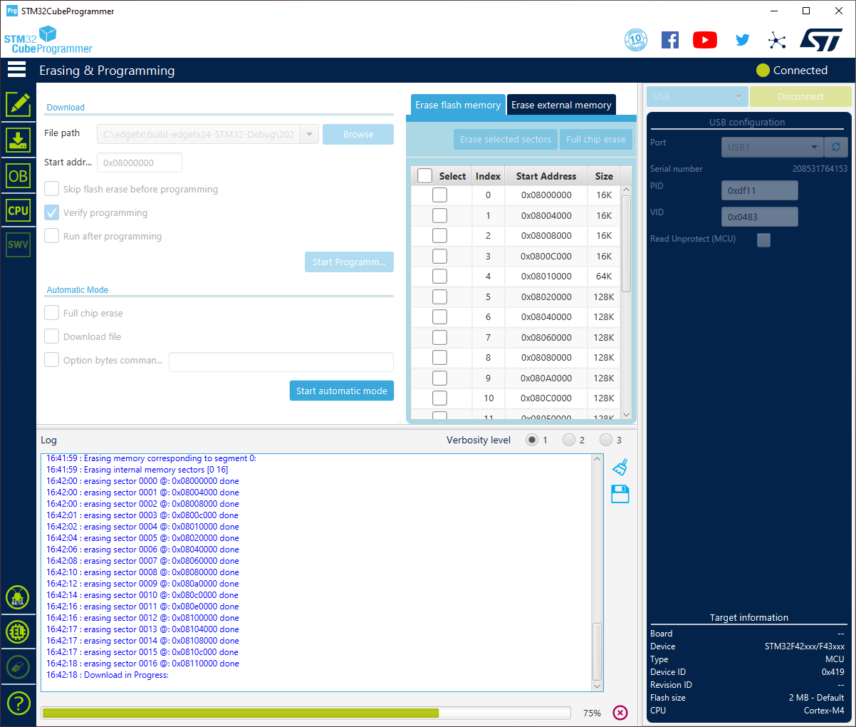 First you should see some messages about erasing sectors and the green progress bar will go back and forth between left and right. This should be followed by a Download in Progress notification with green progress bar at the bottom of the STM32CubeProgrammer growing from left to right: